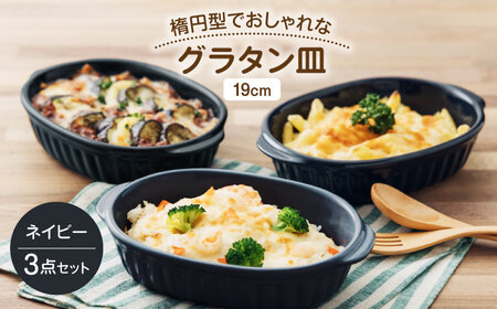 【美濃焼】楕円型でおしゃれなグラタン皿 19cm ネイビー 3点セット 【うつわやさん-カネ忠】 グラタン オーブン 耐熱[MBO056]