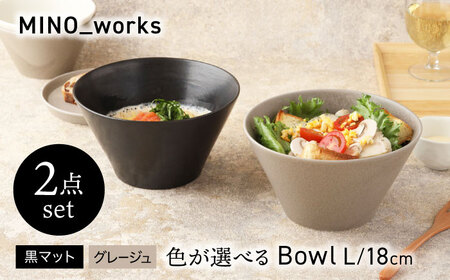 ※こちらはご希望を備考欄に記載いただくお品です※ ※黒マット・グレージュ・黒マット&グレージュの3種よりお選びください。 申込みフォームの備考欄に、必ずご希望の種類を記載いただきますようお願い致します。 【セット内容(下記3パターンからお選びください)】 黒マット:ボウルL 18cm MINO_works 黒マット×2点 グレージュ:ボウルL 18cm MINO_works グレージュ×2点 黒マット&グレージュ:ボウルL 18cm MINO_works 黒マット・グレージュ×各1点 【商品詳細】 サイズ/口径18×高さ10cm 重さ/約507g(商品により誤差があります) 容量/約1300cc(満水) 素材/磁器 質感/マット(ラップはつきません) 電子レンジ、食器洗い機使用可 オーブン不可 【加工地】 土岐市 【対応機器】 電子レンジ○ / オーブン× / 食洗機○ 【お申し込み前に必ずお読みください】 お届けする返礼品には個体差が生じる場合があります。 下部記載の「個体差について」、「破損・欠陥について」を必ずご一読のうえ、お申し込みください。 【色について】 商品写真はできる限り実物の色に近づけるよう徹底しておりますが、 お使いのモニター設定、お部屋の照明等により実際の商品と色味が異なる場合がございます。