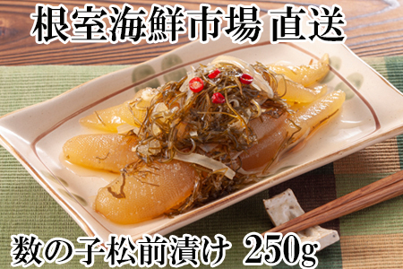 【名称】数の子松前漬け 【内容量】250g×1P 【原産地】ニシン卵/ロシア産 【加工地】根室市 【主要原材料】ニシン卵 【賞味期限】冷凍保存で3か月(解凍後7日) ※但し家庭用冷凍庫の場合、開閉が多く品質劣化する場合がありますので、到着後1か月以内を推奨しています。 【保存方法】要冷凍(-18℃以下で保存) 【加工者】有限会社カネカイチ鈴木商店 北海道根室市光和町1-1 【販売者】株式会社カネカイチ 北海道根室市光和町1-1
