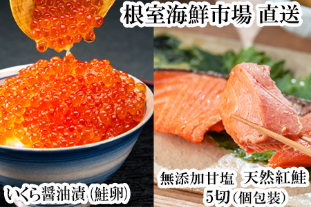 [12月10日決済分まで年内配送]根室海鮮市場<直送>無添加天然紅鮭1切れ真空×5P、いくら醤油漬け(鮭卵)70g×1P G-28068