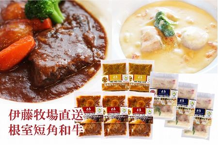 【名称】ビーフシチュー、クリームシチュー、ビーフカレー 【内容量】短角和牛のビーフシチュー230g×3P、鮭・ほたて・花咲がにシチュー210g×3P、短角和牛のビーフカレー230g×2P 【原産地】日本短角和牛・牛乳・シロサケ・ホタテ貝柱/根室産、ハナサキガニ剥き身/根室産・ロシア産 【製造地】根室市 【原材料】日本短角和牛、牛乳、シロサケ、ホタテ貝柱、ハナサキガニ剥き身 【賞味期限】出荷日から冷凍保存で180日 【保存方法】要冷凍(-18℃以下で保存) 【加工者】有限会社伊藤畜産 北海道根室市明郷101番地 【販売者】有限会社伊藤畜産 北海道根室市明郷101番地