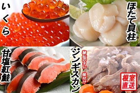 いくら醤油漬け100g、紅鮭5切、ほたて貝柱200g、味付けジンギスカン800gセット B-70033