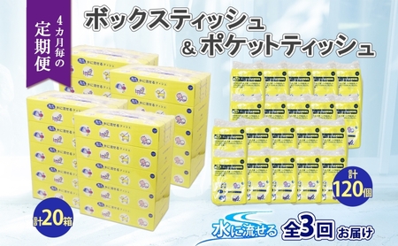 北海道 定期便 4ヶ月毎全3回 とけまるくん ボックス ティッシュ 20箱 ポケット 120個 水に流せる ペーパーリサイクル エコ 香りなし 厚手 日用品 雑貨 常備 備蓄 ストック 送料無料