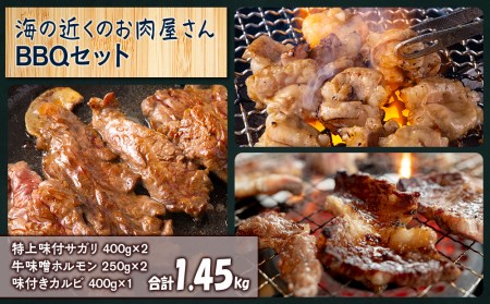 特上味付サガリ 約400g×2 牛味噌ホルモン 約250g×2 味付カルビ 約400g×1 (合計約1.45kg) [原産地]北海道・米国・メキシコ [加工地]白老町 消費期限 返礼品に記載 アレルギー 小麦・牛肉・大豆 事業者 海の近くのお肉屋さん
