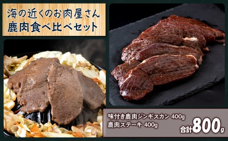 味付鹿肉ジンギスカン 約400g 鹿肉ステーキ 約400g (合計約800g) [原産地]北海道 [加工地]白老町 消費期限 返礼品に記載 アレルギー 小麦・大豆・オレンジ・りんご 事業者 海の近くのお肉屋さん