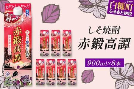 赤鍛高譚パック[900ml]×8本 ※アルコール分20% 【原材料名】 赤紫蘇浸漬酒、醸造アルコール、赤紫蘇蒸留酒、しそ焼酎、食物繊維(ポリデキストロース)/酸味料 【消費期限】 焼酎はアルコール度数が高く、冷暗所で保管され未開封の状態では品質劣化が起きにくく長い間保存が可能です。 そのため、賞味期限は表示されていません。 しかし、容器の材質により風味が変化する場合があるため、瓶では2年、紙パックやペット容器では1年半程度でお召し上がりいただくことがお勧めされています。