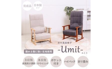 1台1梱包/生産国:中国/完成品 【品名】肘付高座椅子【umit】(ユミト) 【カラー/品番】 アイボリー:83-098 ダークグレー:83-099 【素材】 天然木(ラバーウッド)・スチール・ウレタンフォーム 表面加工:ウレタン塗装 張材:ポリエステル(撥水加工付き) 【本体サイズ】(約)幅52.5×奥行55.5〜99×高さ67〜93cm 座面高:(約)27・31・35cm 【本体重量】(約)9kg 【耐荷重】(約)100kg 【生産国】中国(ギアは日本製) 【付属品】六角レンチ・ポケット・脚裏フェルト(4pcs+予備1pc)・予備部品(各1pc)