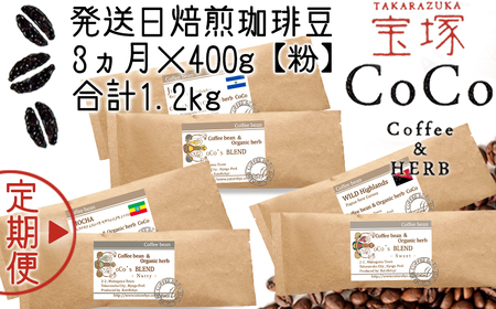 【宝塚】3ヶ月の定期便(当日自家焙煎珈琲豆6種 計1200g)Type2【粉】