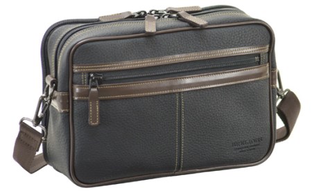 "サイズ:W26XH17XD9(㎝) 本体素材:合皮 付属:牛革・PVC 内装:ナイロン 重量:約350g(本体重量) color:クロ ●A5サイズ●2室式●牛革引手●本体仕様:ポケットX4、底板付●脱着式ショルダーベルト付"