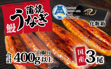 国産うなぎ蒲焼き3尾 400g ※山椒の小袋3袋付きです ※たれは付属いたしません。 ※専用のギフトボックスに入れてお届けとなります。 ※ふるさと納税の記載や、お礼状は同封しておりません。