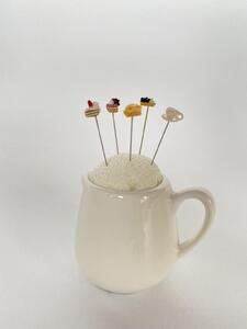 お針山 新針物語~ティータイム~ 外箱の大きさ 縦約6cmx横約8cmx幅約8cm 針山の大きさ(まち針を刺さない状態) 高さ約5.3cmx横約6.2cm