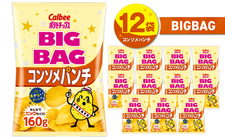 カルビーポテトチップスBIGBAG(コンソメパンチ) 12袋(160g×1袋) --------------------------------------------------- 【賞味・消費期限】 製造日より180日 【保存方法】 常温 【原材料名】 じゃがいも(国産又はアメリカ)、植物油、砂糖、チキンコンソメパウダー(小麦・大豆・豚肉を含む)、食塩、デキストリン、でん粉、粉末しょうゆ、粉末ソース(りんごを含む)、香辛料パウダー、たまねぎエキスパウダー、ビーフコンソメパウダー、野菜パウダー(トマト、にんじん)、ビーフエキスパウダー、梅肉パウダー/調味料(アミノ酸等)、香料(ごま由来)、酸味料、カラメル色素、パプリカ色素、甘味料(ステビア)、香辛料抽出物、ベニコウジ色素 【該当するアレルギー特定原材料等】 小麦・牛肉・豚肉・鶏肉・大豆・ごま・りんご