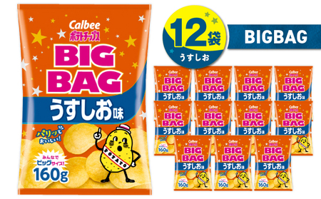 カルビーポテトチップスBIGBAG(うすしお) 12袋(160g×1袋) --------------------------------------------------- 【賞味・消費期限】 製造日より180日 【保存方法】 常温 【原材料名】 じゃがいも(国産又はアメリカ)、植物油、食塩、デキストリン、こんぶエキスパウダー/調味料(アミノ酸等) 【該当するアレルギー特定原材料等】 特定原材料8品目および特定原材料に準ずる20品目は使用していません。