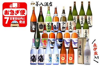 ■各1.8L 計24本セット(各25度) 【全12種類 各1本】 ・森伊蔵(化粧箱入) ・茶房 大海庵 ・海王 ・楔 ・くじらのボトル白 ・くじらのボトル黒 ・くじらのボトル綾紫白 ・くじらのボトル綾紫黒 ・大海蒼々 ・特選大海黒麹 ・さつまの海 ・さつま大海垂水 【全3種類 各2本】 ・apple-rance アップルランス ・海 ・うみ 常圧蒸留 【全1種類 6本】 ・善左衛門