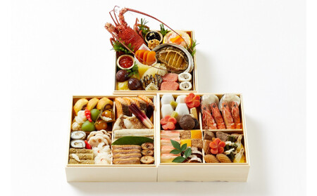 壱之重:伊勢海老蒸(国内製造)、鮑酒蒸し、柿膾、栗金団、イクラ醬油漬け、味噌漬け数の子、穴子八幡巻、黒豆煮、子持ち昆布、手毬麩、唐墨、片口鰯の田作り、クルミ甘露煮、酒精、重曹、水酸化ナトリウム、酸化防止剤(V.C)、漂白剤(亜硫酸塩)、トレハロース、着色料(クチナシ)、(一部にえび・小麦・くるみ・あわび・いくら・大豆を含む) 弐之重:キングサーモン味噌漬(国内製造)、寒鰻味噌漬、子持ち鮎甘露煮、甘鯛麹漬、龍皮巻き、青梅蜜煮、葉付金柑、花百合根、トラ焼、合鴨ロース煮、酢蓮根、菊花蕪、叩き牛蒡、はじかみ、千代呂木/調味料(アミノ酸)、トレハロース、酒精、ビタミンB2、pH調整剤、漂白剤(亜硫酸塩)、ソルビット、ビタミンC、保存料(ソルビン酸)、着色料(赤106)、(一部に小麦・やまいも・さけ・大豆・ごまを含む) 惣菜(おせち和参之重) 参之重:蛤煮(国内製造)、和牛角煮、烏賊松笠、柚子柿、カニ真丈、鴨松風、厚焼玉子、車海老芝煮、筍土佐煮、海老芋煮、梅人参、松笠慈姑、椎茸旨煮、重ねゼンマイ,富貴くちこ射込み/調味料(アミノ酸)、pH調整剤、酒精、トレハロース、保存料(ソルビン酸)、甘味料(ステビア)、着色料(赤106)、(一部にえび・小麦・卵・大豆・牛肉・いかを含む) 【賞味期限】 2026/1/1 【アレルギー】 えび、かに、小麦、卵、乳、あわび、いか、いくら、牛肉、くるみ、ごま、さけ、大豆、鶏肉、やまいも ※ 表示内容に関しては各事業者の指定に基づき掲載しており、一切の内容を保証するものではございません。 ※ご不明の点がございましたら事業者まで直接お問い合わせ下さい。