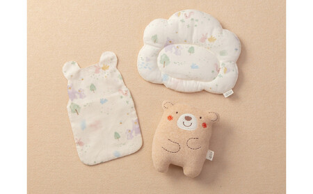 ●まくら:オーガニックコットン100% 表 ダブルガーゼ 裏 シンカーパイル 中綿 ポリステル100% サイズ/21×25 ●汗取りパット:オーガニックコットン100% 表 ダブルガーゼ(プリント柄) 裏 シングルガーゼ(無地) ポケットダブルガーゼ(無地) サイズ/27×17 ●にぎにぎ:オーガニックコットン100% シンカーパイル 中綿 ポリエステル100% 鈴入り サイズ/19×14