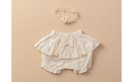 ●フリルパンツフリルパンツ:オーガニックコットン100% ダブルガーゼ 花柄刺しゅうガーゼ サイズ/80 ●ヘアバンド:オーガニックコットン100% シングルガーゼ スノーカット ゴムレース サイズ/ 頭囲32-42