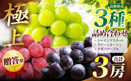 【先行予約】贈答用 信州産 葡萄【詰み合わせ】3房【シャインマスカット、ナガノパープル、クイーンルージュⓇ】