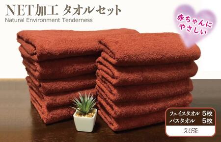 NET抗菌防臭 バスタオル&フェイスタオル 各5枚セット えび茶