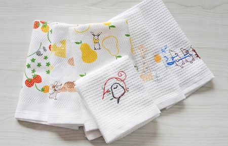 ■内容量 キッチンタオル プリントタイプ3枚(なしとうさぎ・ブレッド・いちご畑) 刺繍タイプ3枚(3ベアーズ・シマエナガ・ピグミージラフ) ■サイズ:約34×38cm