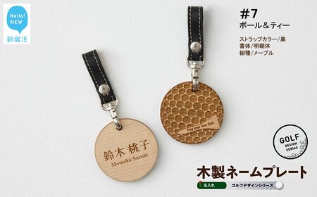 ゴルフ ネームプレート 木製 両面デザイン 本革ストラップベルト 刻印 名入れ (#7:ボール&ティー)【四国加工】