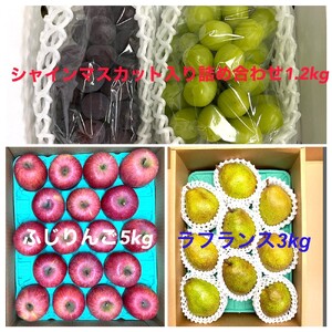 ◆詰め合わせぶどう 合計1.2kg 秀品 ・シャインマスカット1房 ・他品種1~2房(ピオーネ、瀬戸ジャイアンツ、オリエンタルスター、マイハート、コトピーなど) ◆ラ・フランス 3kg 8個~10個 4L~2L 特秀品 ◆サンふじりんご 5kg 12個~20個 秀品 ※個数、サイズの指定はできません。 ※ぶどうの性質上、糖度の上昇等により房から実が外れる場合がございます。ご了承ください。 ※天候により出荷時期や規格(数、サイズ、品種等)を変更する場合がございます。 【アレルギー】 りんご