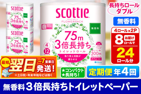 《3ヶ月ごとに4回お届け》定期便 トイレットペーパー スコッティ フラワーパック 3倍長持ち〈無香料〉4ロール(ダブル)×2パック 秋田市オリジナル 最短翌日発送