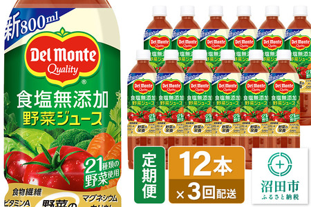 《定期便3ヶ月》デルモンテ 砂糖・食塩無添加野菜ジュース 800ml×12本セット 群馬県沼田市製造製品