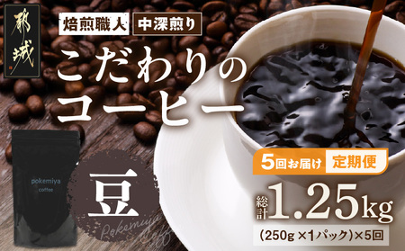 5回お届け!焙煎職人こだわりのコーヒー定期便【豆】250g 小分けパック(ジッパー・バルブ付) ※中深煎り※ポスト投函_TLA5-3302_(都城市) 毎月
