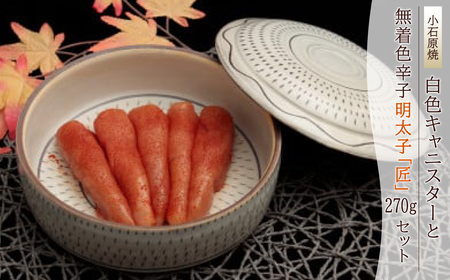 無着色辛子明太子「匠」270g 小石原焼キャニスター(白色)1個 サイズ 径:約17cm×高さ:約7cm 【賞味期限】90日