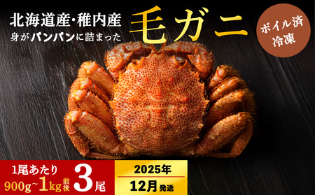 【2025年12月中旬発送】【ボイル済み急速冷凍】身がパンパンに詰まった稚内産毛ガニ900g~1kg(超大サイズ)×3尾
