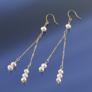 ■ペア(2個)でお届けします。 全長:4.8cm 重さ0.6g ピアス:釣り針式、真鍮、 14GF(金張り) スクリュー鎖、金具:真鍮、K14GF(金張り) 淡水パール:0.35~0.4cm×6珠