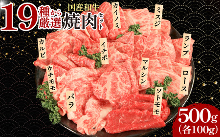 おまかせ焼肉5種セット 各100g (ロース、サーロイン、バラ、外モモ、内モモ、ランプ、カイノミ、イチボ、カルビ、ミスジ、トンビ、ザブトン、上ミスジ、ヒウチ、マルシン、ハバキ、ウデサンカク、フランク、カメノコから5種) ※こちらの返礼品は500gでのお届けになります。