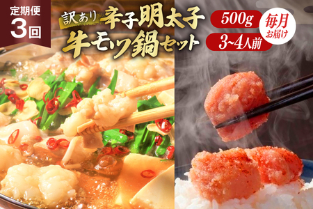 訳あり 3回 定期便 無着色 辛子明太子 切子 500g & 博多 牛もつ鍋 セット 3~4人前 [木村食品 福岡県 筑紫野市 21761213]