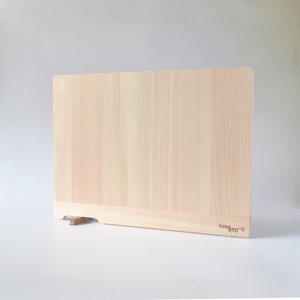 四万十ひのき(まな板本体)、国産の桜(スタンド)、ステンレス(ネジ)、ニッケル(鋲)