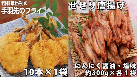 手羽先フライ:約55g×10本×1袋 とりタレ:50ml 鶏せせりの唐揚げ(にんにく醤油味):約300g×1袋 鶏せせりの唐揚げ(塩味):約300g×1袋