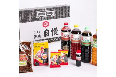醤油老松1L、醤油青(濃口)1L、醤油こむらさき(薄口)1L、サラダず1L、芦北味噌1㎏、寒漬180g、芦北味噌フリーズドライ10g×2、醤油老松80ml