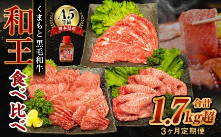 【3ヶ月定期便】 熊本県産 A5等級 黒毛和牛 和王 食べ比べ 合計約1750g 牛肉 セット