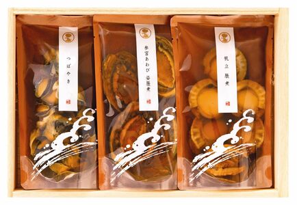 参宮あわび姿脹煮1個(殻・肝付)、つぼやき80g、子持しぐれ80g、帆立山椒煮65g、福寿100g