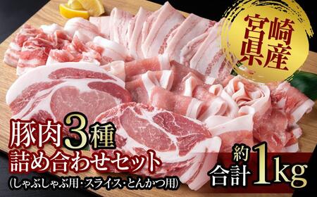 宮崎県産豚肉3種 詰め合わせセット約1kg 小分け しゃぶしゃぶ用・スライス・とんかつ<1-274>★