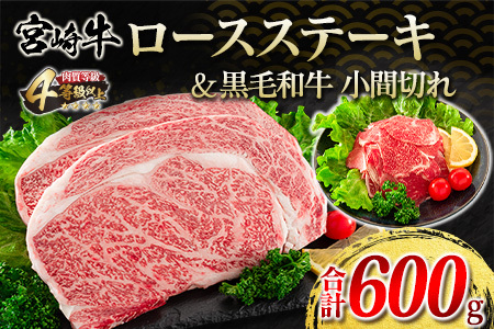 宮崎牛 ロース ステーキ 黒毛和牛 小間切れ セット 合計600g 牛肉 ビーフ 国産 万能食材 ブランド牛 おかず お弁当 おつまみ 食品 おすすめ 焼肉 バーベキュー 鉄板焼き 高級 ご褒美 お祝 記念日 お取り寄せ グルメ 冷凍 詰め合わせ 宮崎県 日南市 送料無料_F62-21