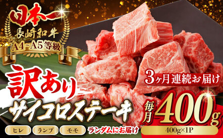 【全3回定期便】【訳あり】長崎和牛 サイコロステーキ 400g A5ランク 赤身(ヒレ・ランプ・モモ ランダムにお届け)【野中精肉店】 [VF91]