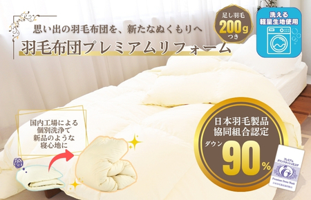 ■羽毛ふとんリフレッシュ加工 一式 プレミアムリフォーム ・仕上がりサイズ:シングル/約150×210cm・足し羽毛/ホワイトダックダウン200g追加 ※受注加工生産のため返品は受けられません。