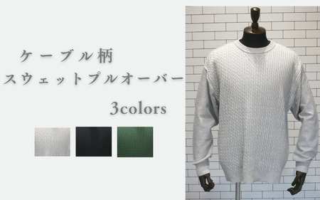 ケーブル柄スウェットプルオーバー カラー:ライトグレー/グリーン/ブラック 素材:綿100% Mサイズ: 着丈66cm、身幅53cm、肩幅50cm、袖丈57cm Lサイズ: 着丈68cm、身幅56cm、肩幅52cm、袖丈58cm XLサイズ: 着丈70cm、身幅59cm、肩幅54cm、袖丈59cm