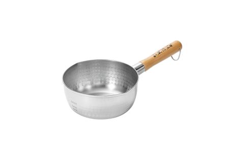 材質:本体:18-8ステンレス鋼(板厚0.8mm)、ハンドル:天然木、金具:ステンレス鋼 サイズ:37.7×21.2cm×9.6cm 鍋高:8cm 重量:615g 満水容量:2.3L ガス火・IHクッキングヒーター対応