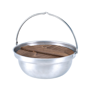 セット内容:焚き火鍋30cm 材質:本体・ツル/ステンレス鋼、フタ/天然木 サイズ:約直径30.5×12(高さ)cm (ツル外寸幅約直径32.5cm) 重量:約1.05kg 満水容量:約6L