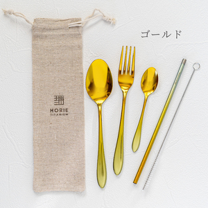セット内容: チタン製カトラリー(布袋入り_材質:綿・リネン) 材質:純チタン 寸法:(約) デザートスプーン 長さ180mm 重量20g ・デザートフォーク 長さ180mm 重量15g ・コーヒースプーン 長さ121mm 重量6g ・ストラー 直径6mm×長さ192mm 重量3.5g ・ブラシ 長さ200mm (材質:ステンレス) 食器洗浄機:非対応