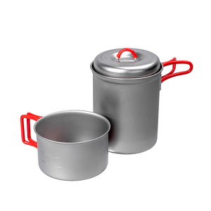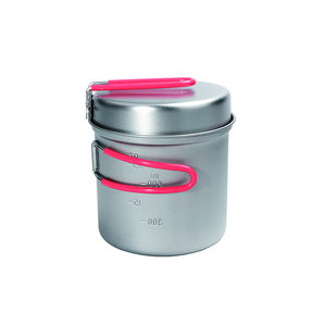 サイズ:径94×深さ118mm(ナベ) 径95×深さ58mm(カップ) 容量:750ml 400ml(目盛付き) 質量:99g(ナベ) 50g(カップ) 素材:純チタン(国内製造) 取っ手部シリコンチューブ付き 生産国:日本