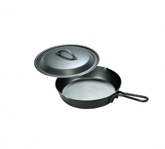材質:本体/黒皮鉄板3.2mm厚・クリアラッカー焼付塗装、ハンドル/直径9mm黒皮無垢棒、蓋/黒皮鉄板2mmクリアラッカー焼付塗装 サイズ(内寸)/鍋径25cm×深さ5cm(全長39cm) 重量/3.2kg