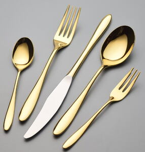 材質:18-10ステンレス 仕上げ:オールミラー仕上げ(24金メッキ) 内容 ディナーナイフ(共柄)鋸刃付(約223㎜、59g)×1本 ディナーフォーク(約183㎜、37g)×1本 ディナースプーン(約181㎜、46g)×1本 ティースプーン(約134㎜、21g)×1本 ケーキフォーク(約140㎜、17g)×1本 ※箱サイズ:55×30×236㎜